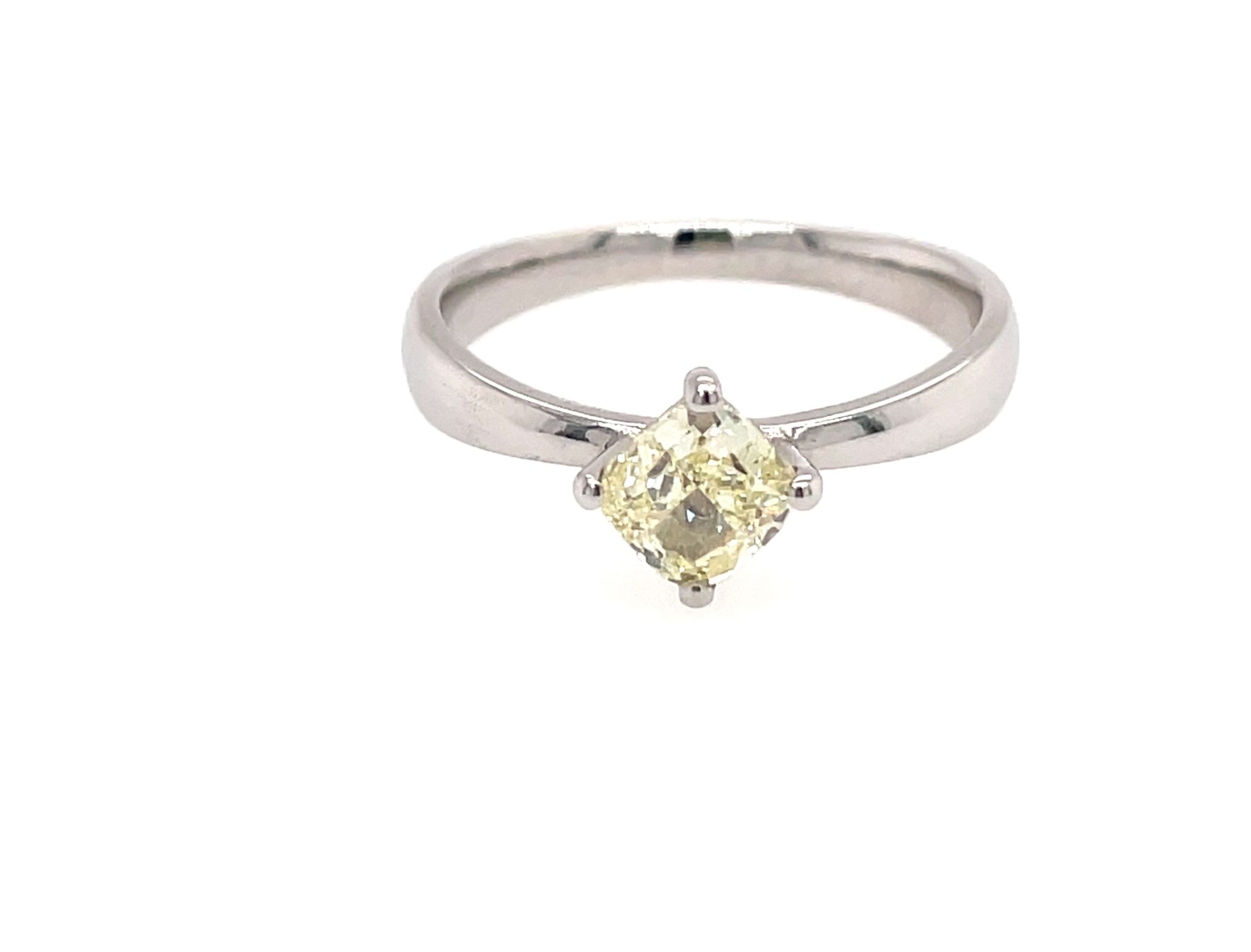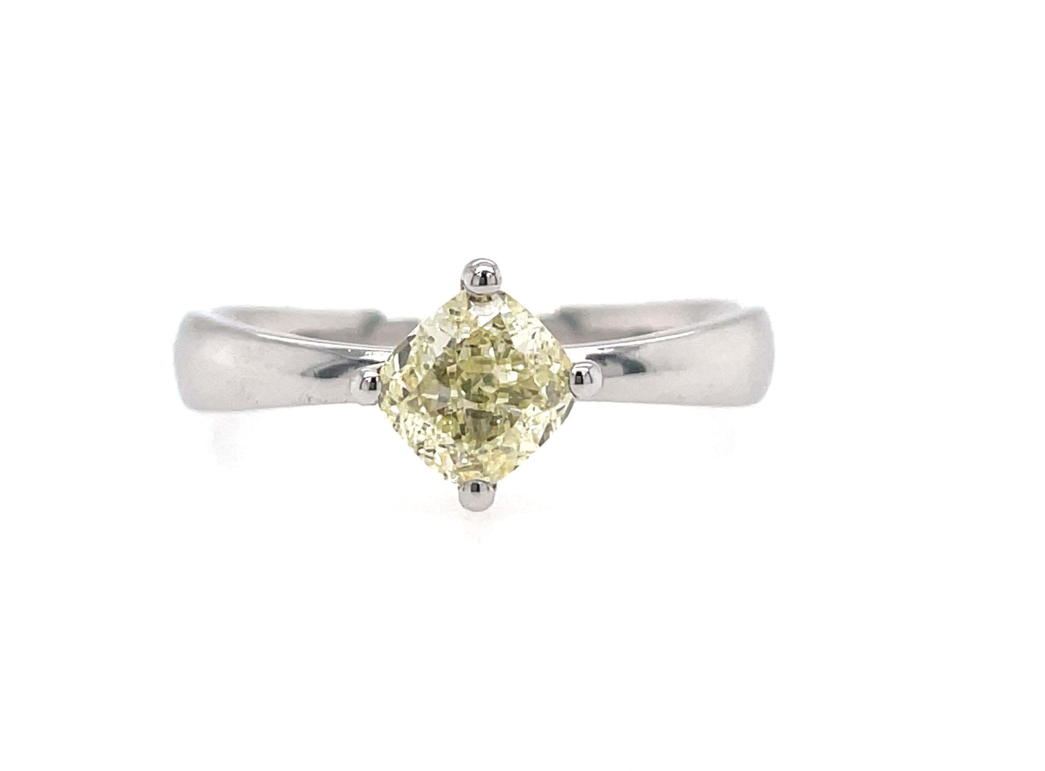 Dieser exquisite Solitärring aus edlem Weißgold 18k besticht durch seinen atemberaubenden 0,90 ct Cushion-Cut Diamanten, der mit seinem einzigartigen Funkeln und seiner außergewöhnlichen Brillanz verzaubert. Der seltene Cushion-Cut verleiht dem Diamanten eine besonders weiche, elegante Form und sorgt für maximales Lichtspiel.