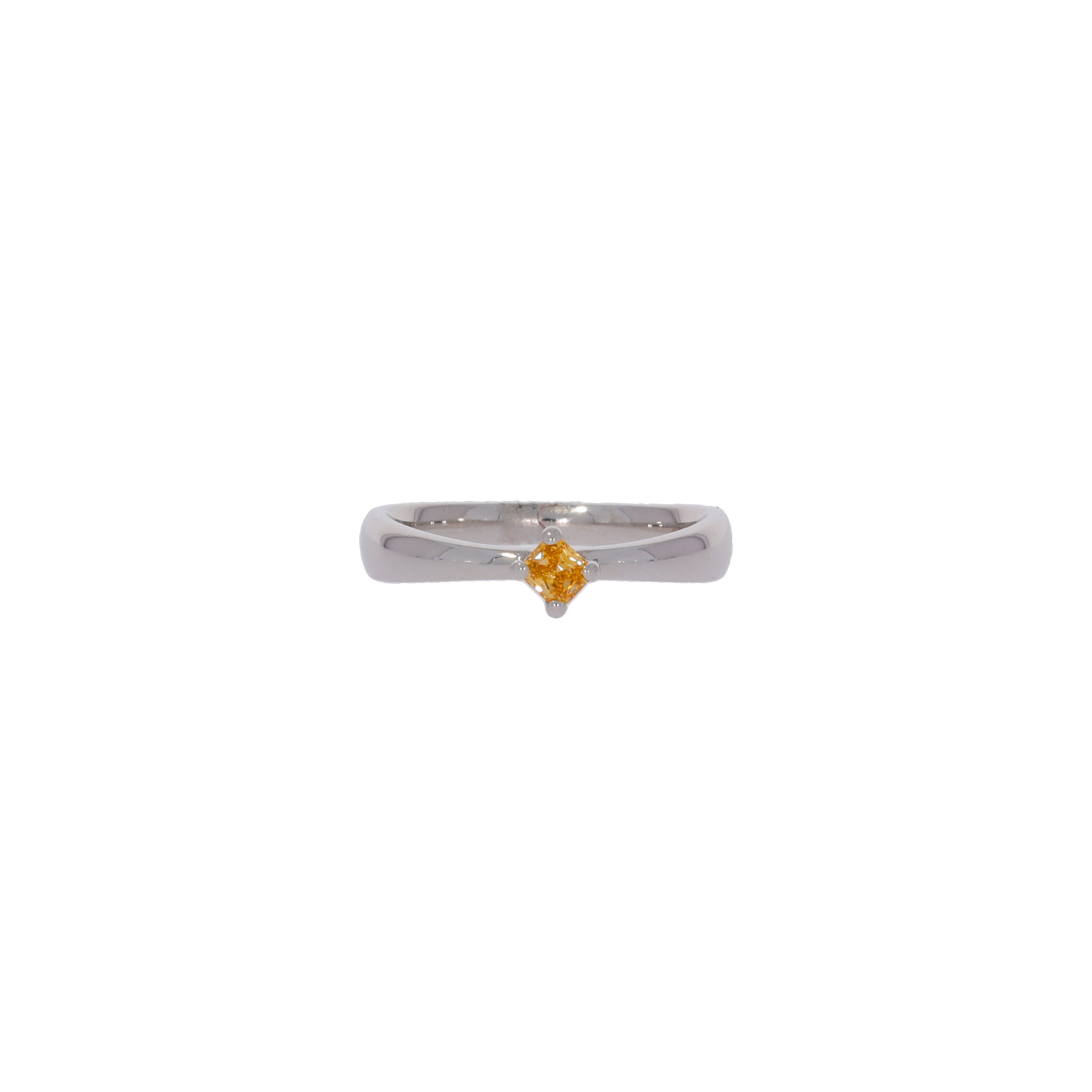 Dieser wunderschöne Solitärring in Weißgold 750 (18k) beeindruckt mit einem 0,14 ct Diamanten im Brillantschliff, der in der außergewöhnlichen Farbe Fancy Intense Yellow-Orange erstrahlt. Der Diamant wurde nach höchsten Standards ausgewählt und besitzt eine außergewöhnliche Brillanz. Mit dem beiliegenden GIA Zertifikat ist die Qualität dieses Diamanten garantiert und unterstreicht den exklusiven Charakter dieses Schmuckstücks.